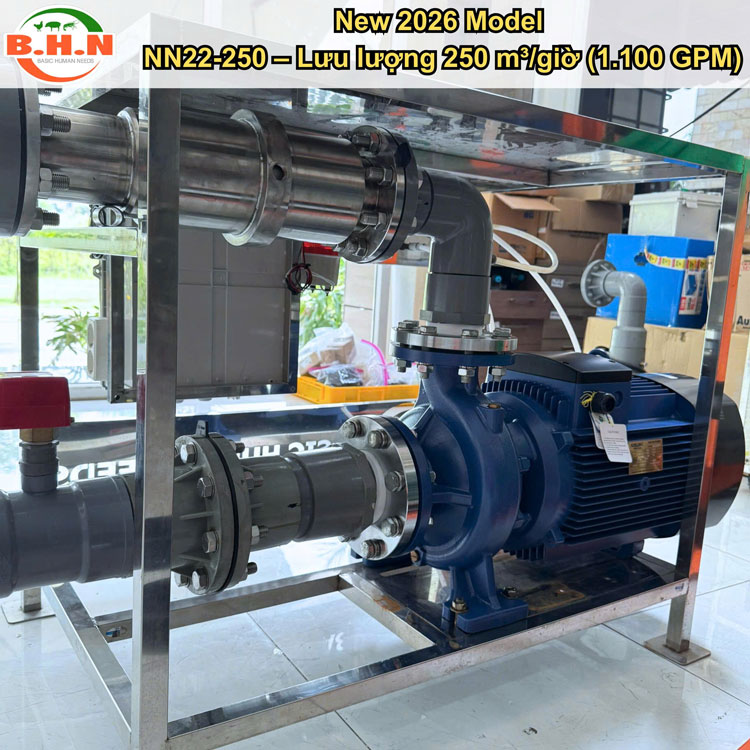 Máy Tạo Siêu Bọt Khí Nano Bubble Công Suất NN22 - 250 chính thức ra mắt vào đầu năm 2026. Hệ thống sở hữu thiết kế công suất lớn với lưu lượng 250 m³/giờ (1.100 GPM). Máy vận hành hoàn toàn tự động, cấp khí trực tiếp không cần máy nén khí, giúp đảm bảo hoạt động ổn định, nâng cao hiệu quả năng lượng và giảm đáng kể chi phí bảo trì.