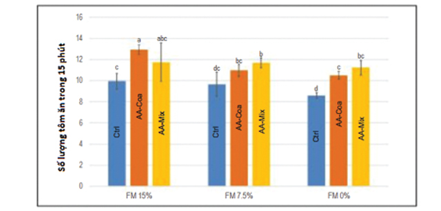 Các nhà nghiên cứu cũng tiến hành quan sát số tôm ăn thức ăn sau 15 phút suốt 8 tuần thử nghiệm. Trong mọi tình huống, không xét đến hàm lượng bột cá, MFAA đều có khả năng làm tăng số lượng tôm ăn trong 15 phút sau khi được thả ra cao hơn so với nhóm đối chứng.
