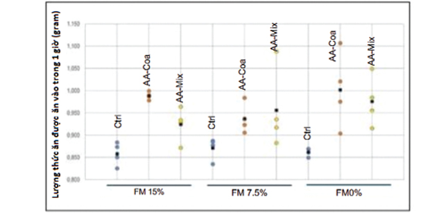 Đáng ngạc nhiên, thức ăn được tiêu thụ sau một giờ chìm vào nước đã không bị ảnh hưởng bởi hàm lượng bột cá. Hình 3 chỉ rõ lượng tiêu thụ thức ăn trung bình của tôm ở 36 bể trong thử nghiệm này. Xu hướng dễ thấy đó là lượng ăn vào tăng cao ở những con tôm được cho ăn thức ăn phủ MFFA (AA-Coa), tiếp đến là nhóm AA-Mix và cuối cùng là nhóm đối chứng.