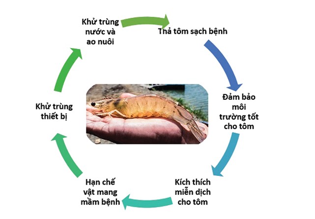 Bên cạnh đó, cần nâng cao sức đề kháng cho tôm nuôi bằng quản lý chăm sóc tốt và dùng thức ăn chất lượng cao. Khi ao nuôi xuất hiện dịch bệnh người nuôi cần có phương án xử lý thích hợp để tiêu diệt mầm bệnh, tránh lây lan.