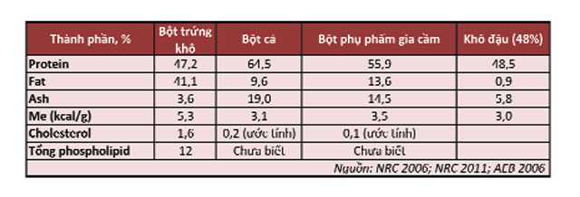 Toàn bộ thành phần dinh dưỡng có trong trứng gà khác biệt so các thành phần thức ăn thủy sản truyền thống. So sánh với khô đậu tương, thành phần protein của bột trứng cũng xấp xỉ; các thành phần axit amin cũng vượt bột cá, trên 80% (bảng). Ngoài ra, bột trứng rất giàu phospholipids (12%); trong số này có 75% là phosphatidylcholine và chứa hàm lượng rất cao cholesterol (xấp xỉ 16.000 mg/kg). Cả hai thành phần phospholipids và cholesterol đều có những giá trị dinh dưỡng quan trọng và không thể thay thế với nhiều loại thủy sản nuôi.