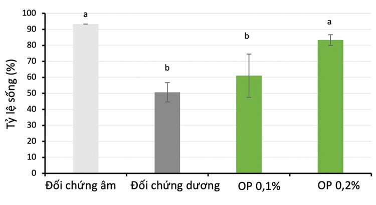 10 ngày sau thử thách, tôm nhiễm bệnh không sử dụng OP đạt tỷ lệ sống 50% so với nhóm tôm không nhiễm bệnh. Cả hai nghiệm thức sử dụng OP đều cho kết quả cải thiện rõ rệt về tỷ lệ sống sau gây nhiễm dịch bệnh, trong đó OP tỷ lệ 0,2% cải thiện tỷ lệ sống 83% so với 50% ở nhóm đối chứng dương.