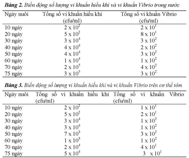 Việc sử dụng hệ thống siêu âm và Nano khí đã khống chế rất tốt sự biến động của vi khuẩn hiếu khí và vi khuẩn Vibrio trong nước và trên cơ thể tôm (Bảng 2 và bảng 3). Tổng số vi khuẩn hiếu khí trong môi trường nước trong suốt quá trình nuôi luôn ở ngưỡng thấp (nhỏ hơn 103 cfu/ml) và số lượng vi khuẩn Vibrio luôn nhỏ hơn 103 cfu/ml.