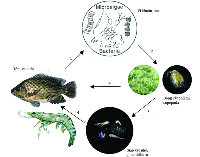 1: Phân thải của tôm, cá nuôi cung cấp nguồn dinh dưỡng cho vi khuẩn và thực vật phù du