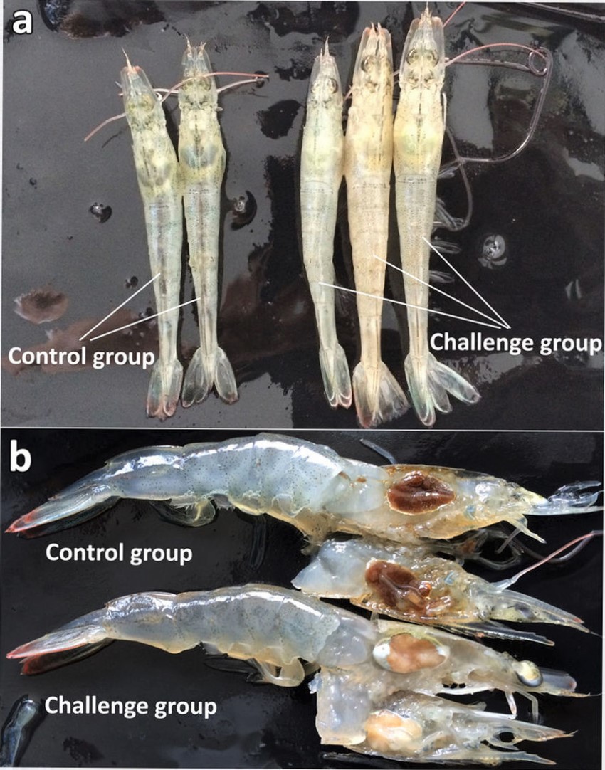 Các dấu hiệu bị nhiễm bệnh được ghi nhận là: tôm đỏ thân, mềm vỏ, chìm xuống đáy ao. Khoảng hai đến ba ngày sau, tất cả tôm trong ao sẽ nhiễm bệnh và chết.