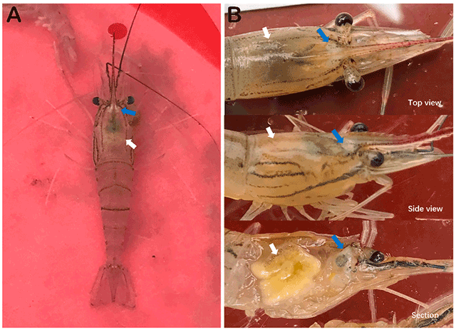 Triệu chứng lâm của tôm càng xanh bị nhiễm tự nhiên với DIV1. (A) Tổng thể một con tôm bị bệnh trong nước. (B) Cận cảnh: Mũi tên màu xanh cho thấy khu vực màu trắng dưới lớp biểu bì. Mũi tên trắng biểu thị teo gan, phai màu và ố vàng.