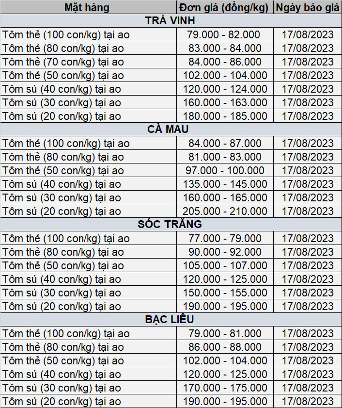 - Giá tôm nguyên liệu tuần 31/7 - 4/8/2023(15/09/2023)