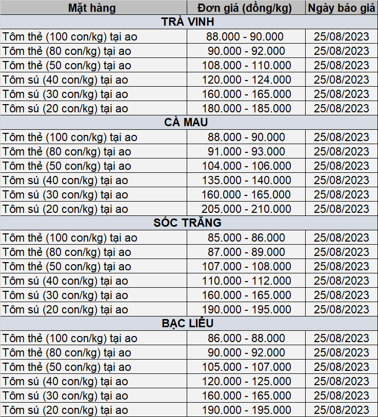 - Giá tôm nguyên liệu tuần 14/8 - 18/8/2023(15/09/2023)