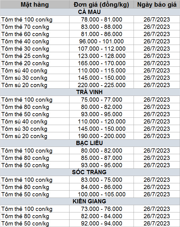 - Giá tôm nguyên liệu tuần 10/7 - 14/7/2023(27/07/2023)