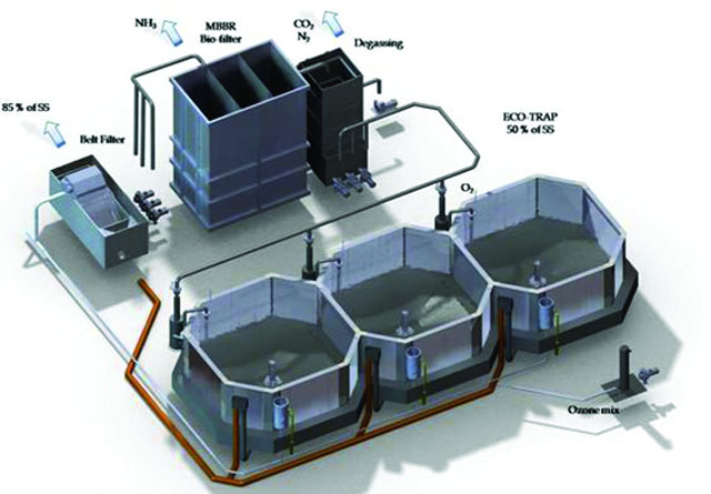 Hệ thống RAS bao gồm bể cá nuôi, bể lọc lắng, cơ học, bể lọc sinh học, hệ thống đường ống cấp, thoát nước và sục khí.