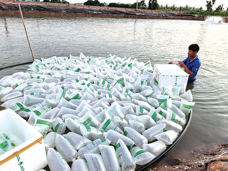 Sau khi nhiệt độ đã cân bằng, tiến hành thả tôm giống ra ao nuôi, bổ sung Vitamin C liều 5 pmm ngay tại khu vực thả tôm để giúp tôm nhanh hồi phục và chống sốc.