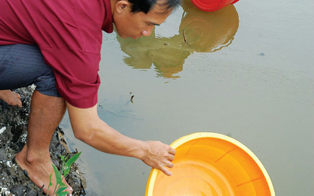 Người dân thả nuôi tôm càng xanh Ảnh: Minh Triết
