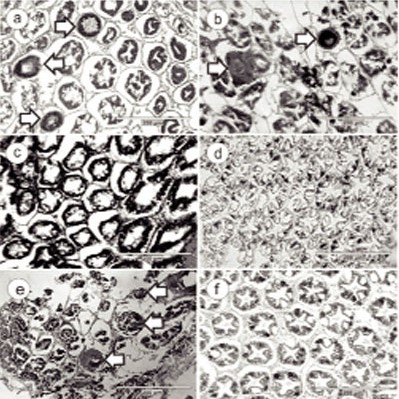Gan tụy của tôm nhiễm NHP-B tiếp xúc với. (a) 5 microgam AgNPs trong 12 ngày; (b) 5 microgam AgNPs trong 24 ngày; © 35 microgam AgNPs trong 12 ngày, (d) 35 microgam AgNPs trong 24 ngày. Kiểm soát tôm không có AgNPs: (e) bị nhiễm bệnh; (f) không bị nhiễm bệnh. Các mũi tên cho biết điểm lây nhiễm vi khuẩn.
