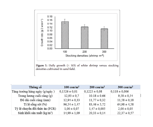 Kết quả cho thấy tỷ lệ sống có sự khác biệt đáng kể giữa ba nghiệm thức (p <0,05). Giá trị của tỷ lệ chuyển đổi thức ăn (FCR) trong thời gian nuôi cũng thay đổi giữa ba nghiệm thức. FCR tăng lên khi mật độ tôm tăng lên. Giá trị FCR nhỏ nhất khi nuôi tôm ở mật độ 100 con/m2 là 1.00 và lớn nhất là mật độ 300 với FCR là 2.0.