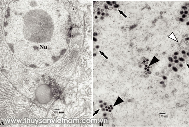 Hình 1: Mô gan tụy tôm hùm bông bệnh đỏ thân (do cảm nhiễm nhân tạo) và tôm khỏe duới kính hiển vi điện tử. A- mô gan tụy tôm khỏe; B- mô gan tụy tôm bệnh. Mũi tên đen chỉ virus (virion) cắt dọc và cắt ngang; đầu mũi tên đen chỉ lõi (genom) của virus; đầu mũi tên trắng chỉ vỏ capsit của virus (không có lõi ở bên trong) (theo Võ Văn Nha, 2009)