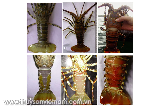Hình 2: Một số dấu hiệu nhận biết bệnh đỏ thân ở tôm hùm bông. A, B- mặt lưng và bụng tôm khỏe; C,D- mặt lưng và bụng tôm có màu đỏ nhạt, E- tôm đỏ toàn thân và cơ vùng giữa giáp đầu ngực và thân phình ra; F- mặt bụng tôm đỏ bầm (theo Võ Văn Nha, 2009)