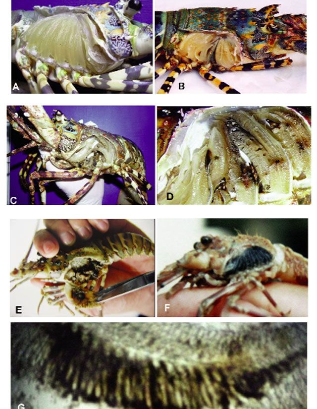 Hình 4: Một số dấu hiệu nhận biết bệnh đen mang ở tôm Hùm Bông. A- mang tôm khỏe, B- mang tôm có màu nâu đỏ, C- mang tôm bị thương tổn, D- mang tôm có chấm màu đen, E- mang tôm bị phá hủy hoàn toàn. F, G- mang bị đen do mùn bả hữu cơ (theo Võ Văn Nha, 2009)