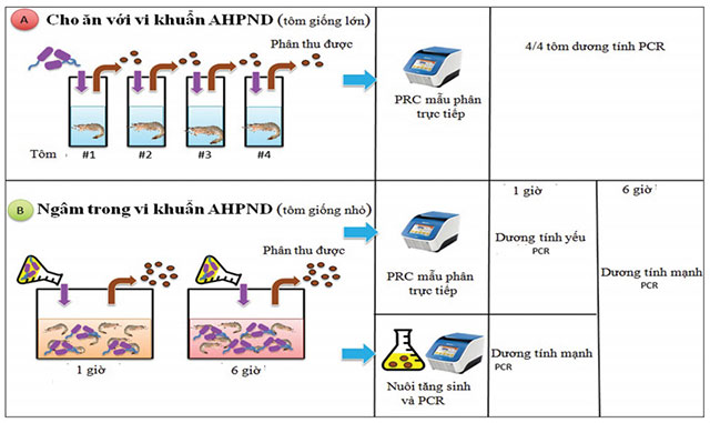 Tôm thẻ chân trắng SPF (80 con tôm, trọng lượng trung bình 0,7 g/con) được sử dụng trong hai thí nghiệm cảm nhiễm mầm bệnh AHPND-V. parahaemolyticus trong 1 và 6 giờ. Mẫu phân được thu sau 24 giờ từ mỗi thí nghiệm cảm nhiễm. Một phần của mẫu phân được li trích DNA và phân tích PCR; một phần được nuôi trên môi trường TSB+ (theo tỷ lệ 1:1000) và ủ ở nhiệt độ 29-29 độ C trong 6 giờ; mẫu này sau đó được sử dụng trực tiếp để phân tích PCR mà không cần ly trích DNA.
