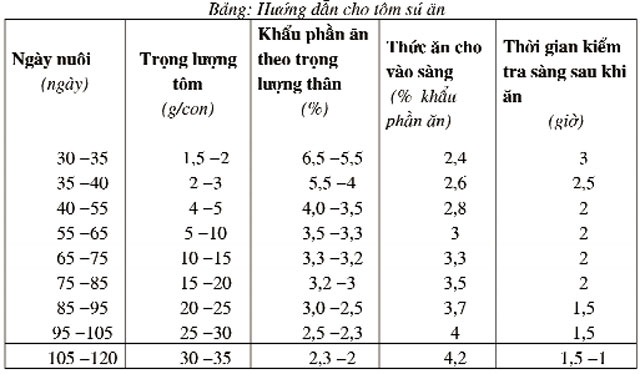 Trong quá trình nuôi, sau khi thả tôm khoảng 20 ngày, người nuôi cần đặt sàng tập cho tôm vào ăn để điều chỉnh lượng thức ăn được chính xác và phù hợp. Sàng ăn đặt cách chân bờ 1,5 – 2 m, sau cánh quạt nước 12 – 15 m, không đặt ở các góc ao, mỗi sàng ăn đặt cho diện tích 1.000 – 1.500 m2. Chọn thức ăn có độ đạm từ 35 – 42% tùy theo giai đoạn của tôm; thức ăn phải có mùi đặc trưng hấp dẫn tôm và phải đảm bảo theo quy định của Bộ NN&PTNT; Trong giai đoạn này, người nuôi có thể cho tôm ăn và theo dõi lượng thức ăn qua bảng hướng dẫn cho tôm sú ăn như sau: