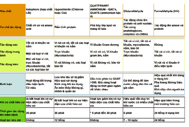 Bảng bên dưới liệt kê vài ví dụ để trại nuôi có thể ứng dụng để tiến hành so sánh và chọn loại sát khuẩn phù hợp.