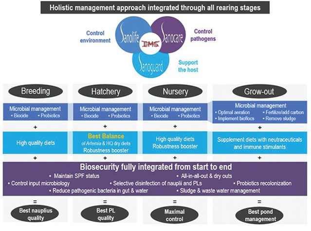 Hội chứng chết sớm (EMS) hay bệnh hoại tử gan tụy cấp (AHPND) được gây ra bởi nhóm vi khuẩn Vibrio parahaemolyticus. Đây là một loài vi khuẩn được nghiên cứu và biết đến rộng rãi trong ngành nuôi tôm nhiều thập kỷ qua. Vì vậy, người nuôi cần phải xem xét lại rằng EMS/AHPND được gây ra bởi một loại vi khuẩn V.parahaemolyticus, chứ không phải là một loại virus. Trong hai thập kỷ qua, phần lớn các biện pháp an toàn sinh học trong ngành tôm trên thế giới đều nhằm vào mục tiêu quản lý virus để loại trừ mầm bệnh. Việc làm này khó khăn hơn nhiều so với việc quản lý tác nhân gây bệnh phổ biến như V.parahaemolyticus. Dựa vào kinh nghiệm và những thông tin có sẵn, các nhà nghiên cứu đã đưa ra cách quản lý toàn diện để đối phó với EMS/AHPND gồm: Quản lý tốt môi trường nuôi tôm ổn định và tối ưu; Cải thiện sức khỏe tôm nuôi bằng cách tối ưu hóa chất dinh dưỡng và bổ sung các chất hỗ trợ hệ miễn dịch; Hạn chế sự hiện diện của virus và vi khuẩn độc hại, ngăn chặn các vi khuẩn cơ hội xâm nhập ở từng giai đoạn nuôi của tôm.